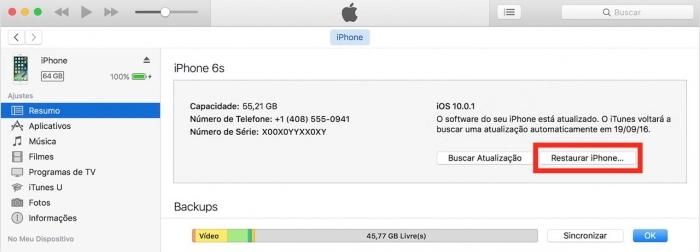 4. Na guia “Resumo” do iTunes, clique em “Restaurar iPhone” e clique de novo em “Restaurar”, e depois aguarde até que o processo conclua.